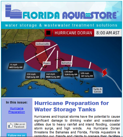 - Topical –The email references an upcoming, shared event that many of Florida Aquastore’s customers will experience next week, namely the arrival of Hurricane Dorian, currently graded a 4 by the National Hurricane Center (NHC). Being alert to what is top of mind for your customers and nimble enough to respond quickly with content are valuable attributes in connecting to your customers.